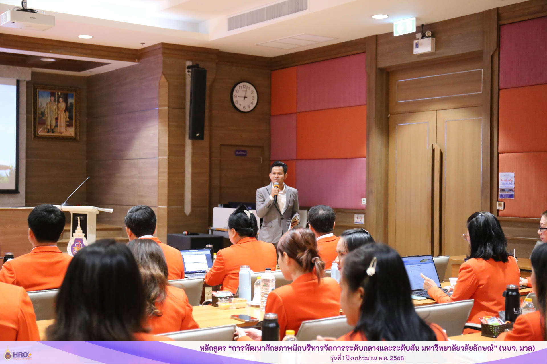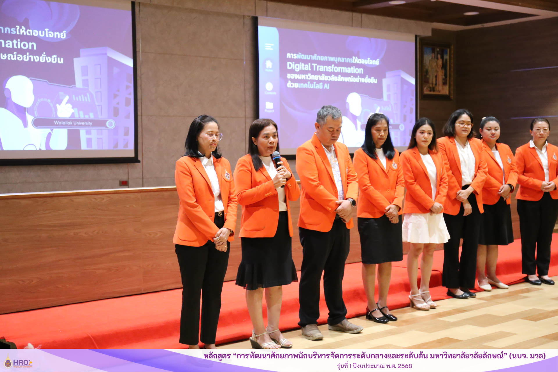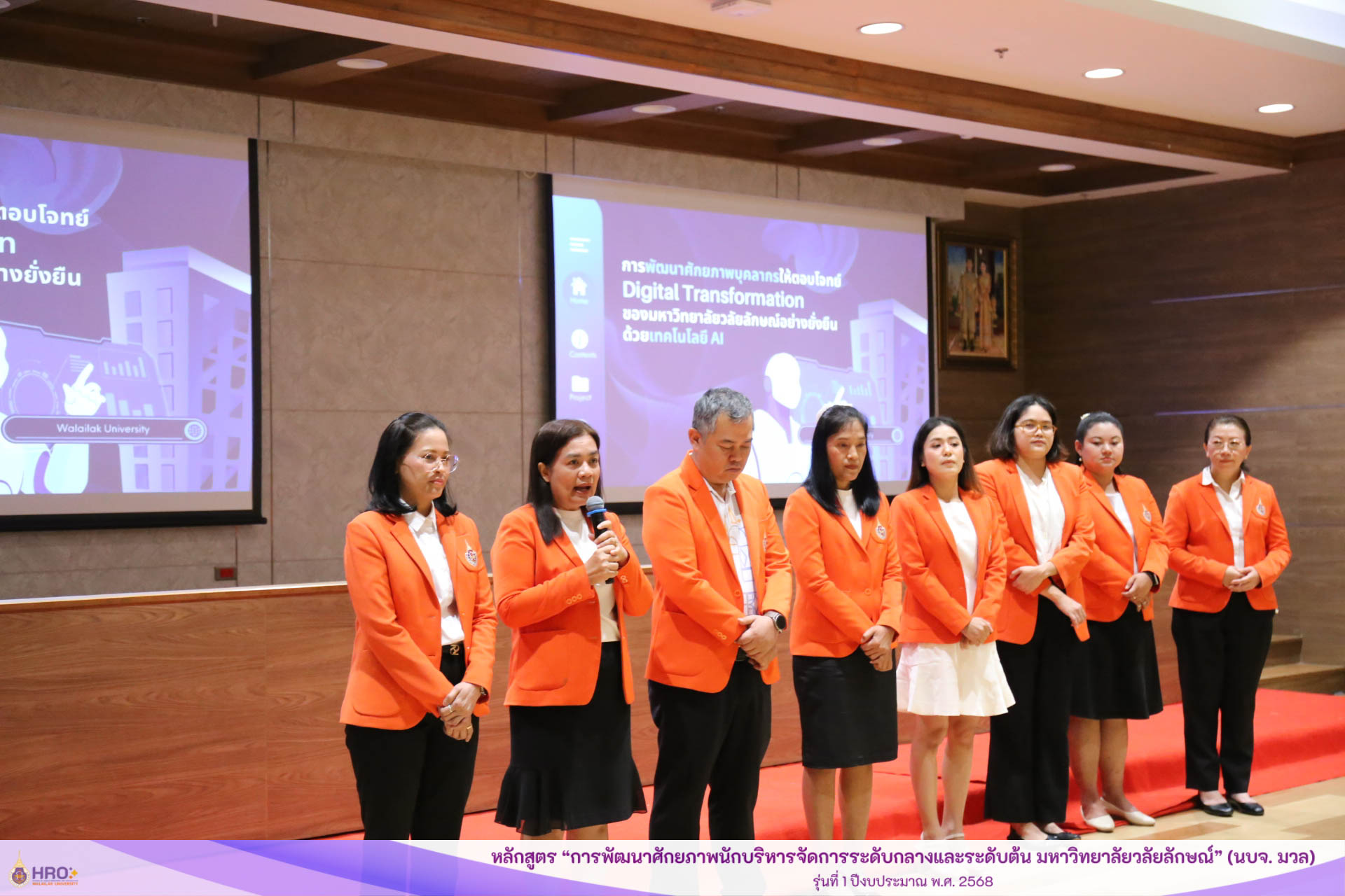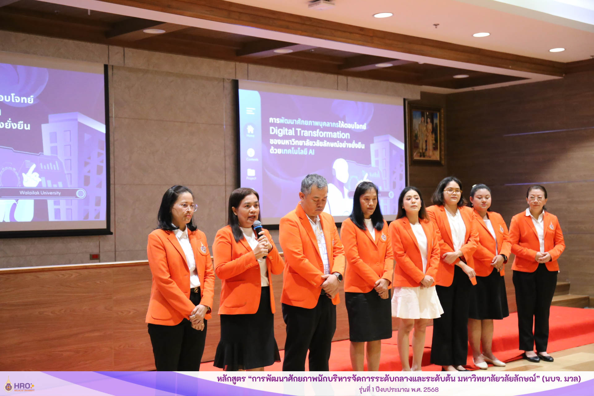 เมื่อวันที่ 17 กรกฎาคม 2568 ส่วนทรัพยากรมนุษย์และองค์กร มหาวิทยาลัยวลัยลักษณ์ ได้จัดกิจกรรมอบรมภายใต้หลักสูตร “การพัฒนาศักยภาพนักบริหารจัดการระดับกลางและระดับต้น มหาวิทยาลัยวลัยลักษณ์” (นบจ. มวล) Module 5 หัวข้อ “การจัดทำรายงานการศึกษาและการนำเสนอรายงานการศึกษา” ณ ห้องประชุมหัวตะพาน ศูนย์การแพทย์มหาวิทยาลัยวลัยลักษณ์ โดยมี ศาสตราจารย์ ดร. สมบัติ ธำรงธัญวงศ์ อธิการบดีมหาวิทยาลัยวลัยลักษณ์ พร้อมด้วยคณะผู้บริหารระดับสูง ได้แก่ รองอธิการบดี และผู้ช่วยอธิการบดี รวม 12 ท่าน เข้าร่วมรับฟังการนำเสนอ และให้ข้อเสนอแนะเชิงสร้างสรรค์แก่ผู้เข้าอบรมทุกกลุ่ม