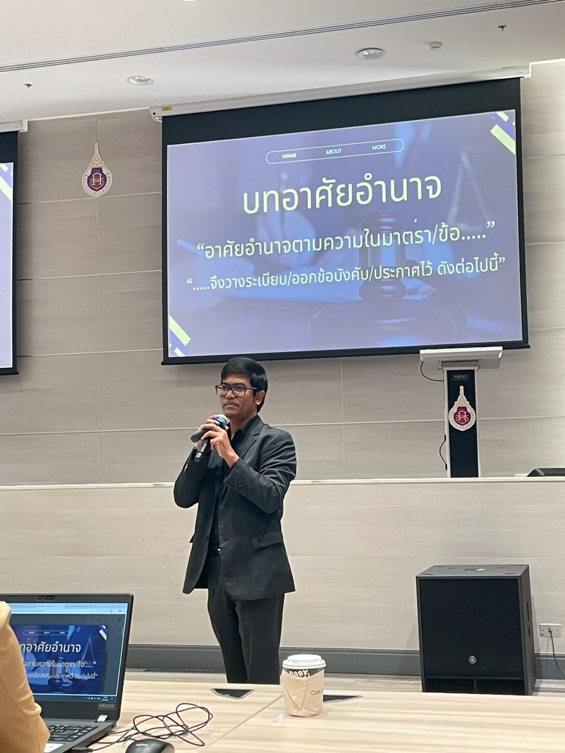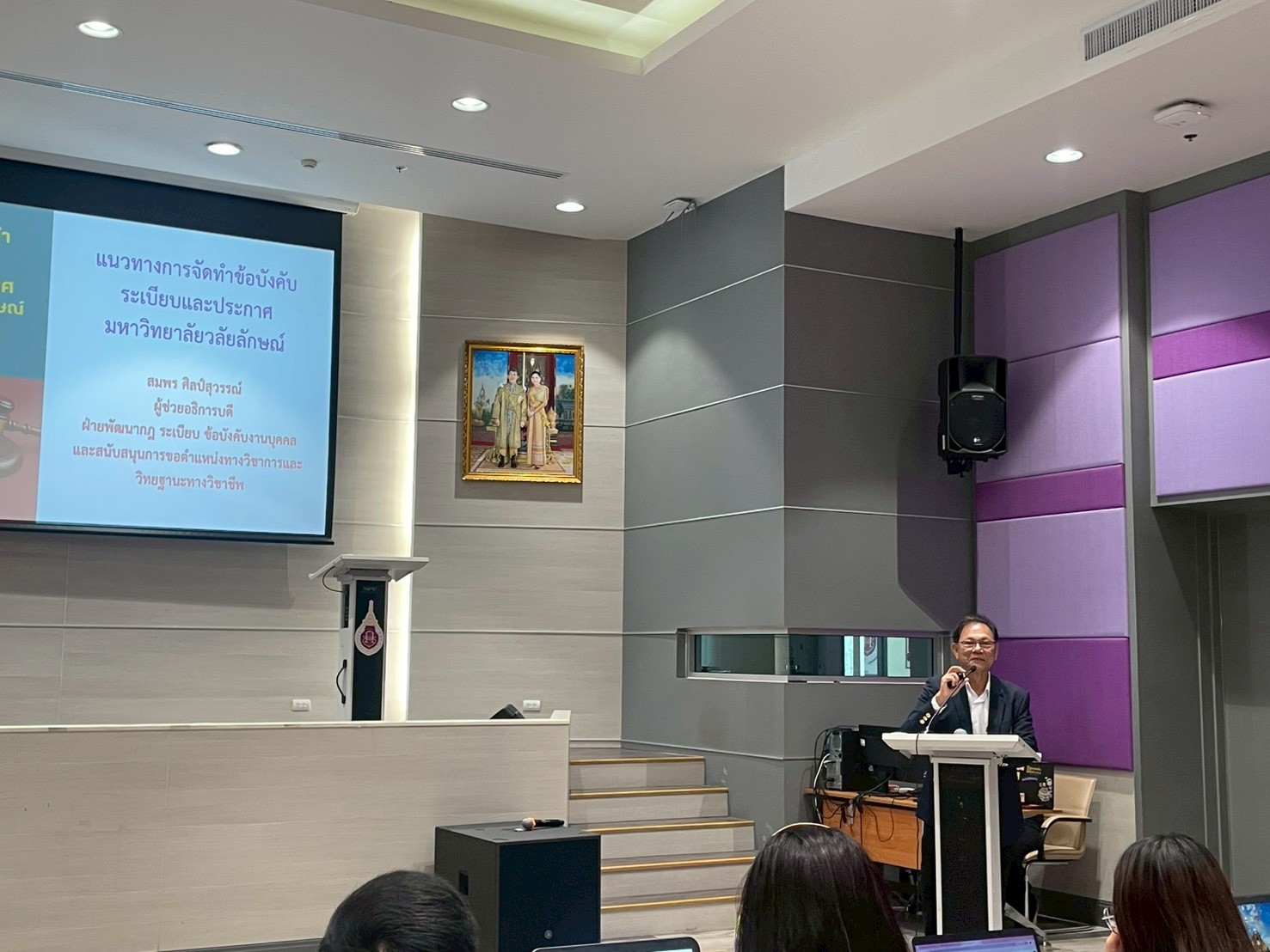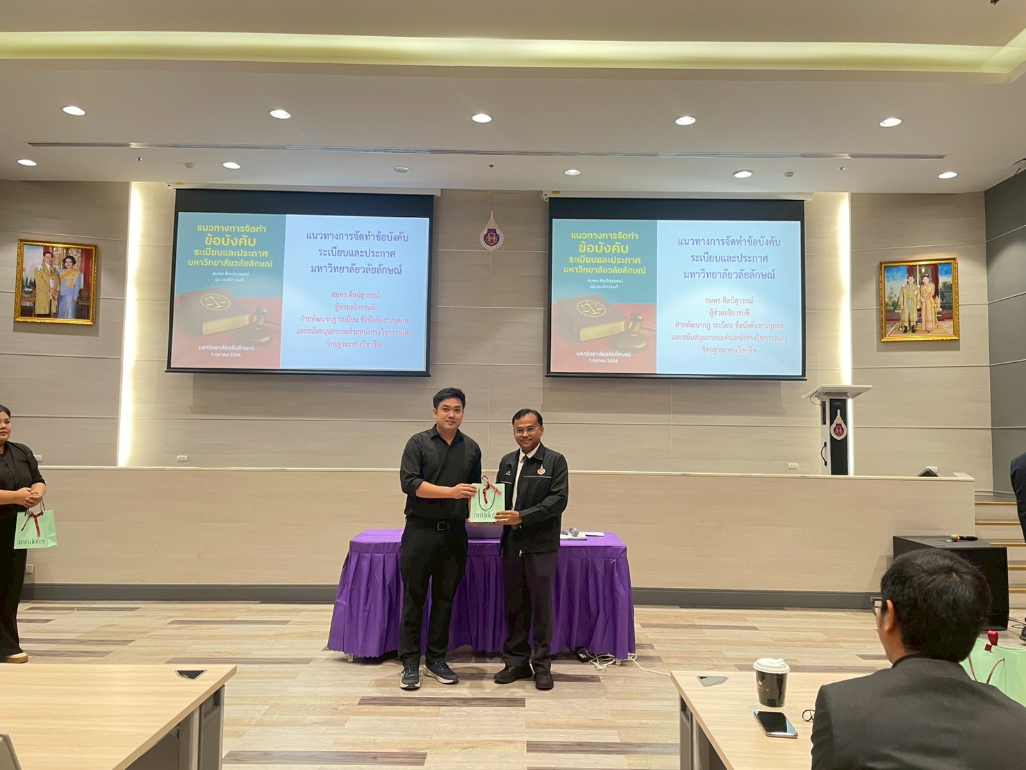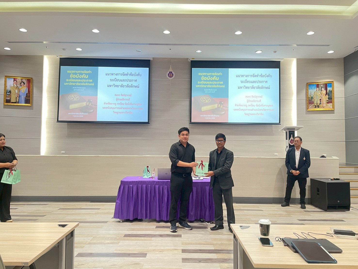 ต่อด้วยการบรรยายในประเด็น “อำนาจในการออกข้อบังคับ ระเบียบและประกาศของมหาวิทยาลัยวลัยลักษณ์” โดยนายนิกร ดวงสุวรรณ รักษาการแทนหัวหน้างานนิติกรรมสัญญา ส่วนนิติการ และหัวข้อ “กระบวนการและขั้นตอนการตรวจสอบของคณะทำงานกลั่นกรอง (ร่าง) ระเบียบ ข้อบังคับ ข้อกำหนด และประกาศของมหาวิทยาลัย” โดยนายบรรจงวิทย์ ยิ่งยงค์ หัวหน้าสำนักงานสภามหาวิทยาลัย รวมถึงการแนะนำการจัดทำเอกสารผ่านระบบสารบรรณอิเล็กทรอนิกส์ (DOMS) เพื่อให้การดำเนินงานเป็นไปอย่างมีประสิทธิภาพและตรวจสอบได้